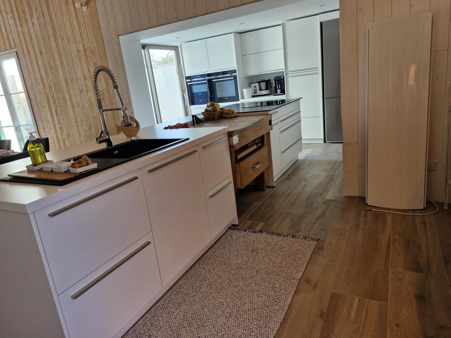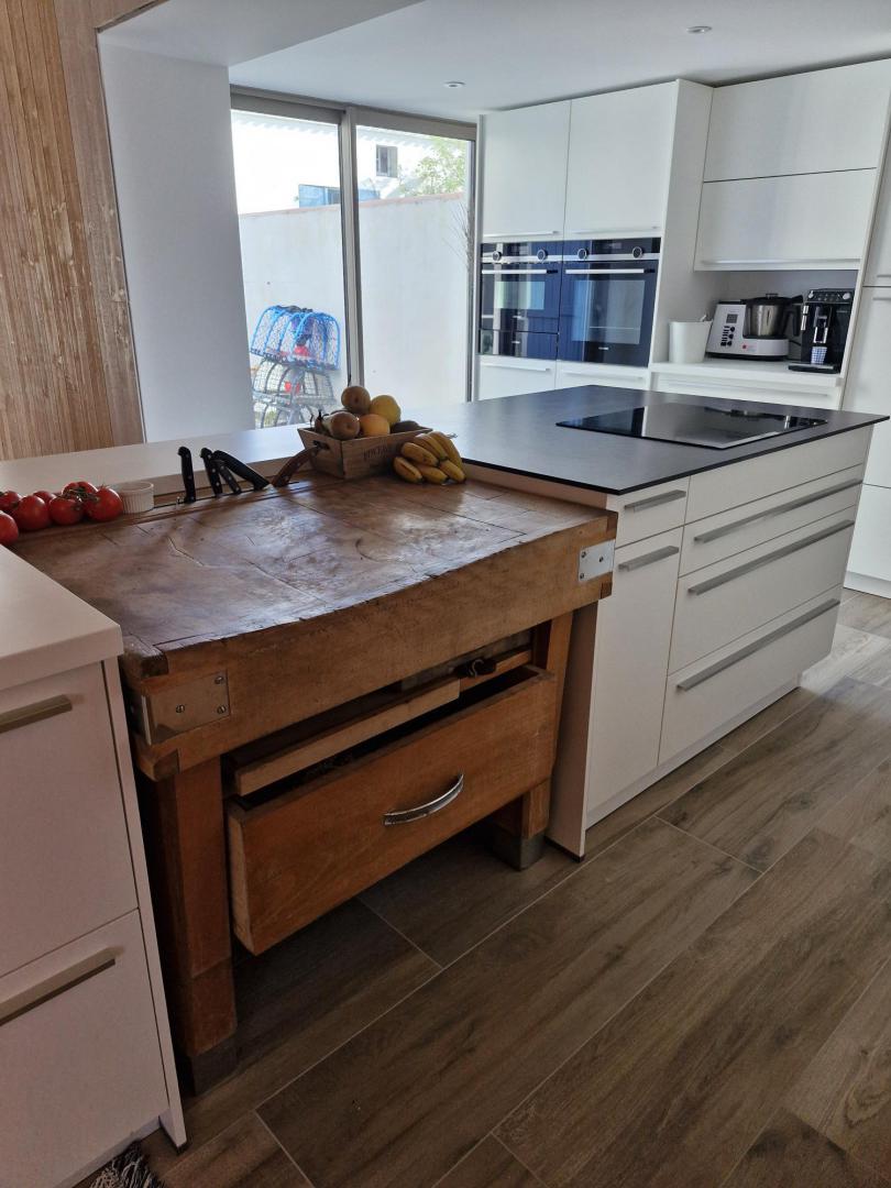 Et une cuisine où le billot de famille s’intègre parfaitement à l’ilot.