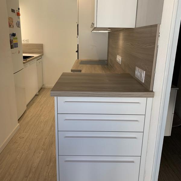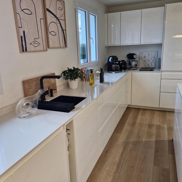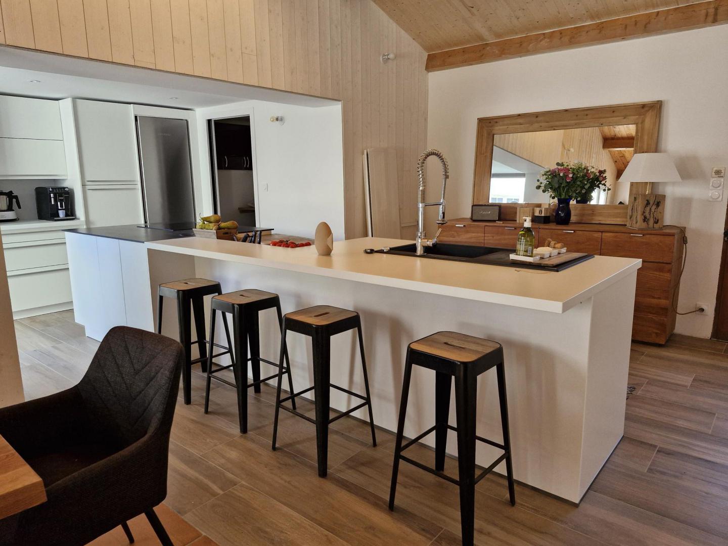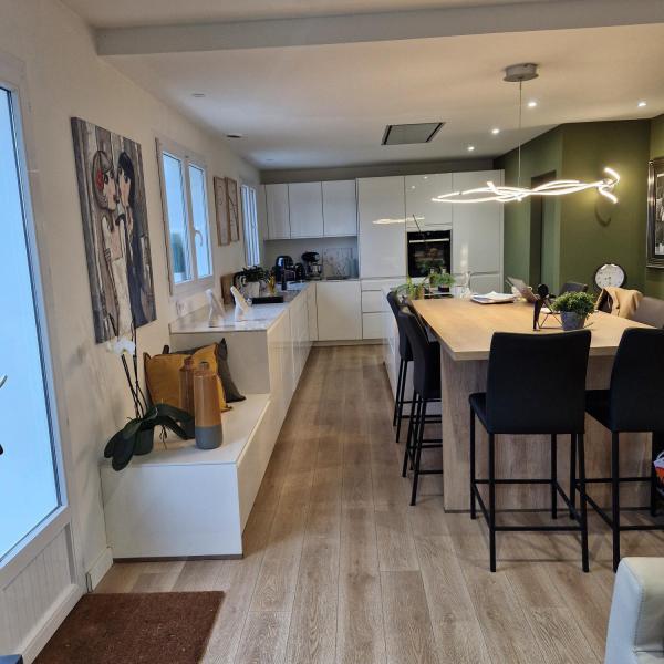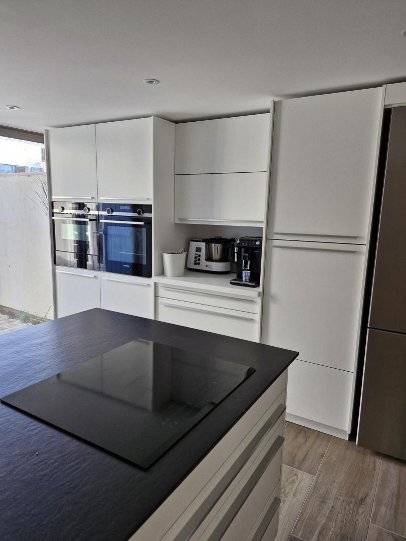 Nous avons tout refait du sol au plafond, nous avons créé une descente du plafond pour y intégrer une hotte NOVY, ultra silencieuse, avec son moteur déporté.